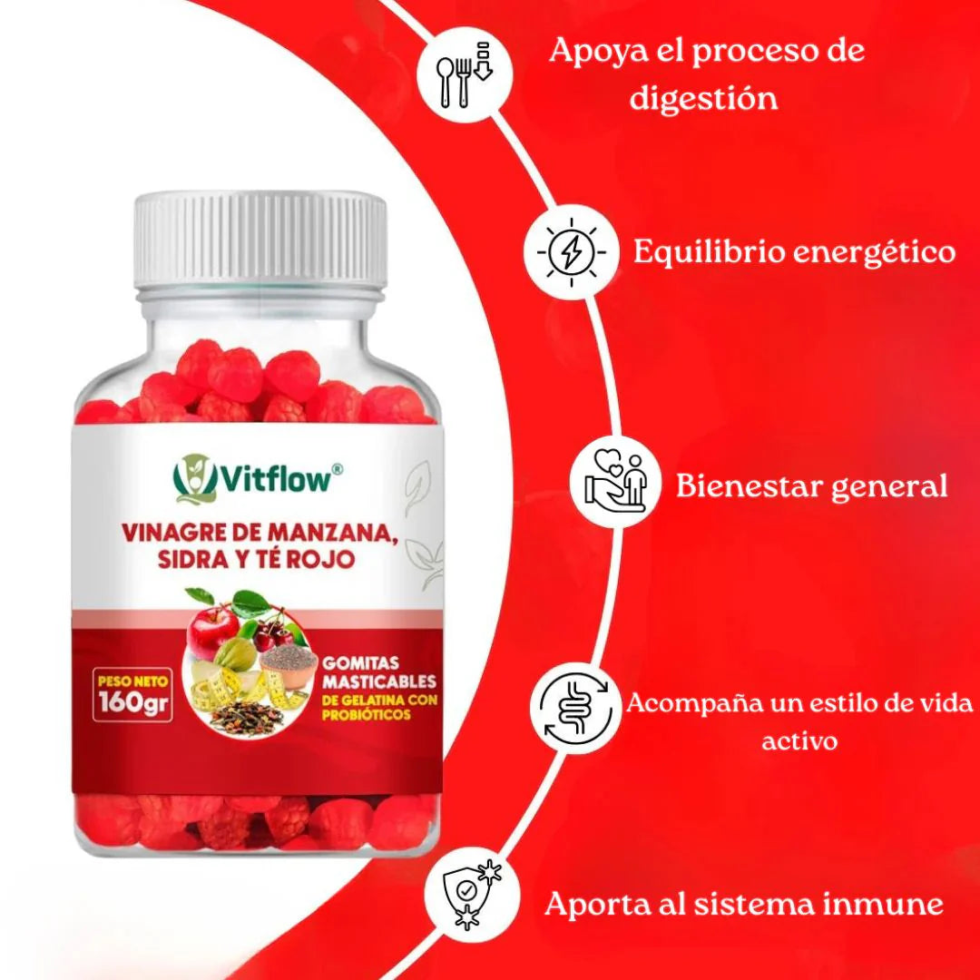 Las gomitas contienen vinagre de sidra de manzana que estimula las enzimas digestivas, mejorando así la digestión y haciéndote sentir más ligera y cómoda.
